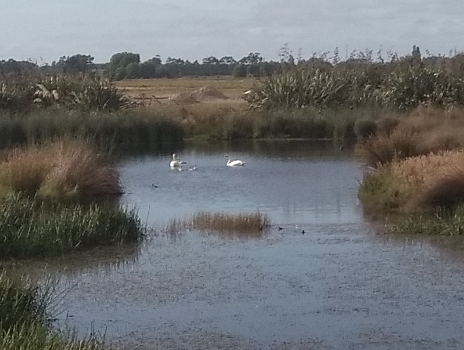 At first it was black swans taking up residence in the newly created wetland a couple of hundred metres from where I live. A couple of years ago a pair of white swans arrived with a brood of almost grown cygnets, which have since departed. The adult pair reappeared, but I can’t say for sure whether it is the same pair as before. They have been keeping a low profile lately and I was beginning to wonder whether they had moved away, again so what a thrill it was to see they have merely shifted to a different pond and produced five cygnets. That’s seven swans a-swimming at Christmas, but they are camera-shy and you’ll have to look hard to see the cygnets in this photo.